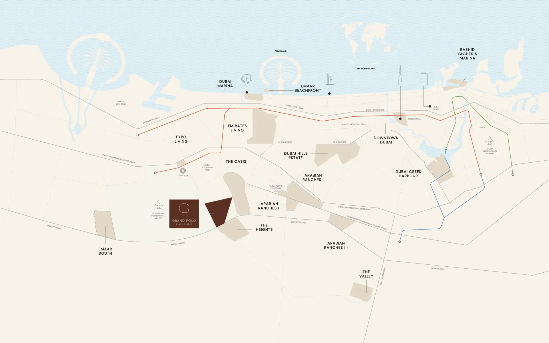 Emaar Grand Polo is strategically located in Dubai Investment Park 2 at the junction of Expo Road (E77) and Emirates Road (E611), offering seamless connectivity to Al Maktoum International Airport, Downtown Dubai, Dubai Marina and key lifestyle hubs while nestled beside premium communities like The Oasis and The Heights.